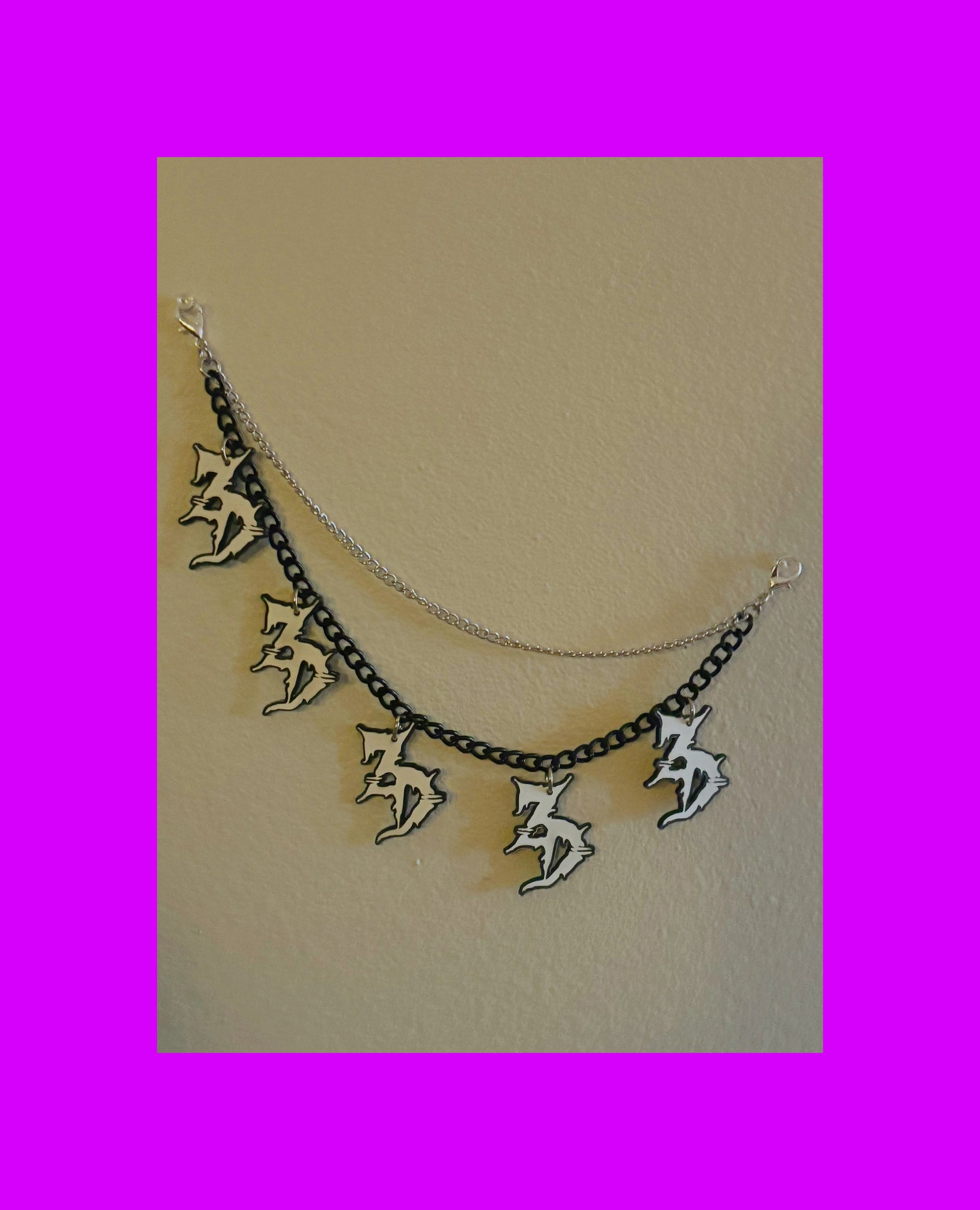 black iron chain, silver stainless steel chain and hardware with black and white acrylic charms.