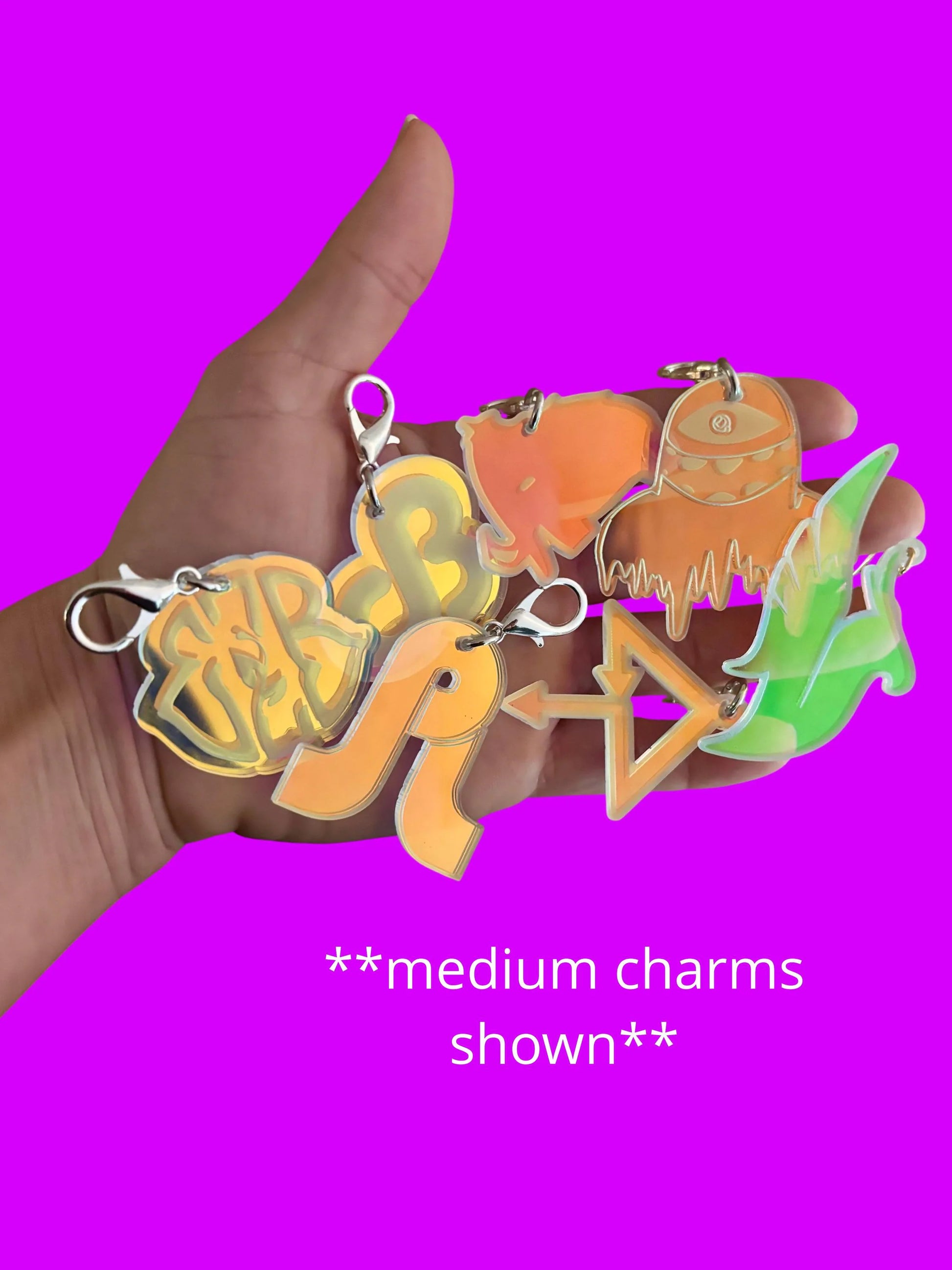 acrylic charms- your choice of small medium or large- see photos for size reference- attached to a hat clip or clasp to hang from your hats, keychains, outfits, anything! See other listings for other colors