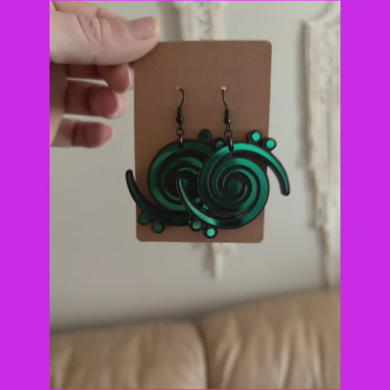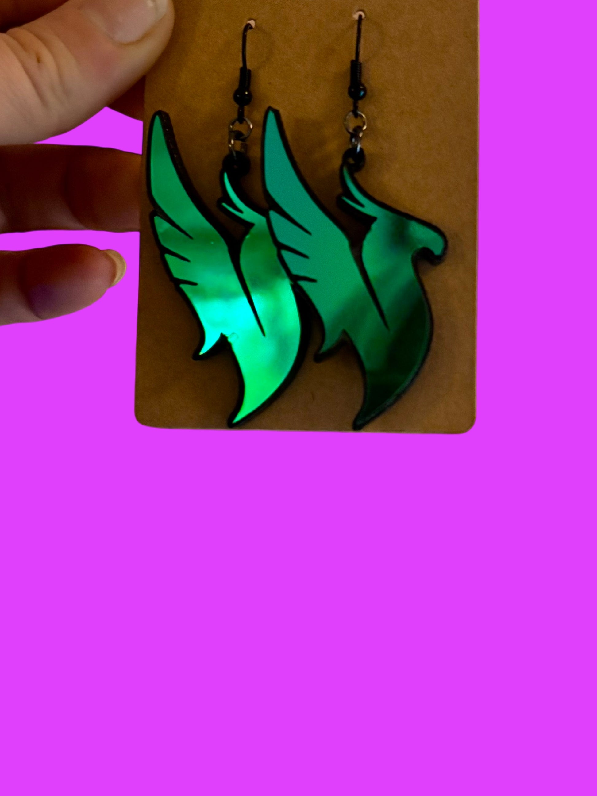 Acrylic earrings- holographic with a teal/pine green/dark blue color shift that engraves black! overall a shiny teal color!