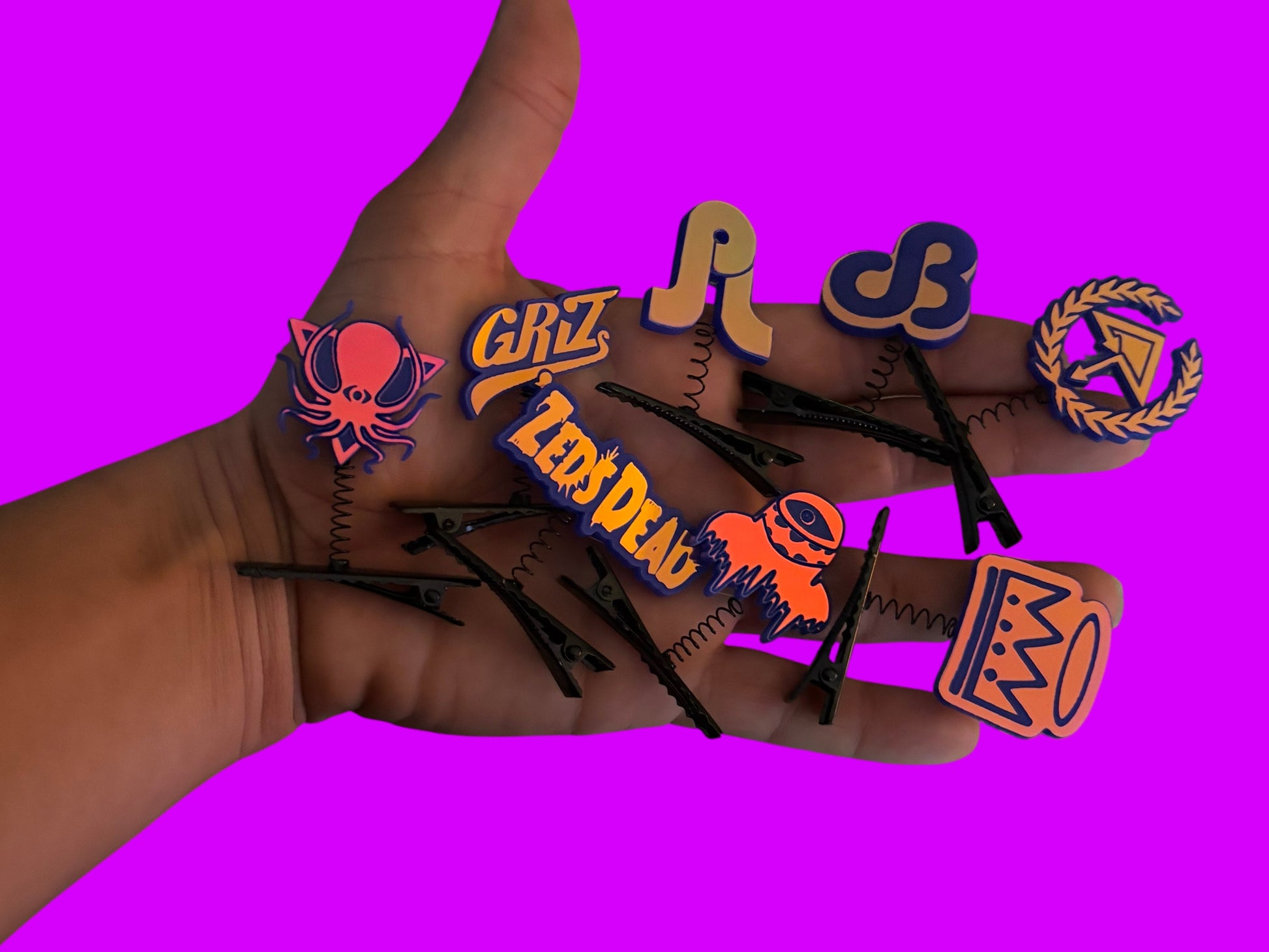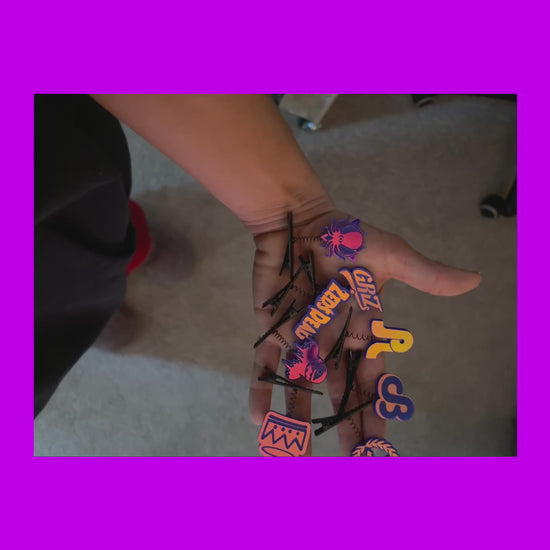 acrylic charms super glued onto spring sprout clips! charms are a holographic acrylic with a violet/ hot pink/ yellow/ green color shift and engrave indigo blue! overall a violet color.