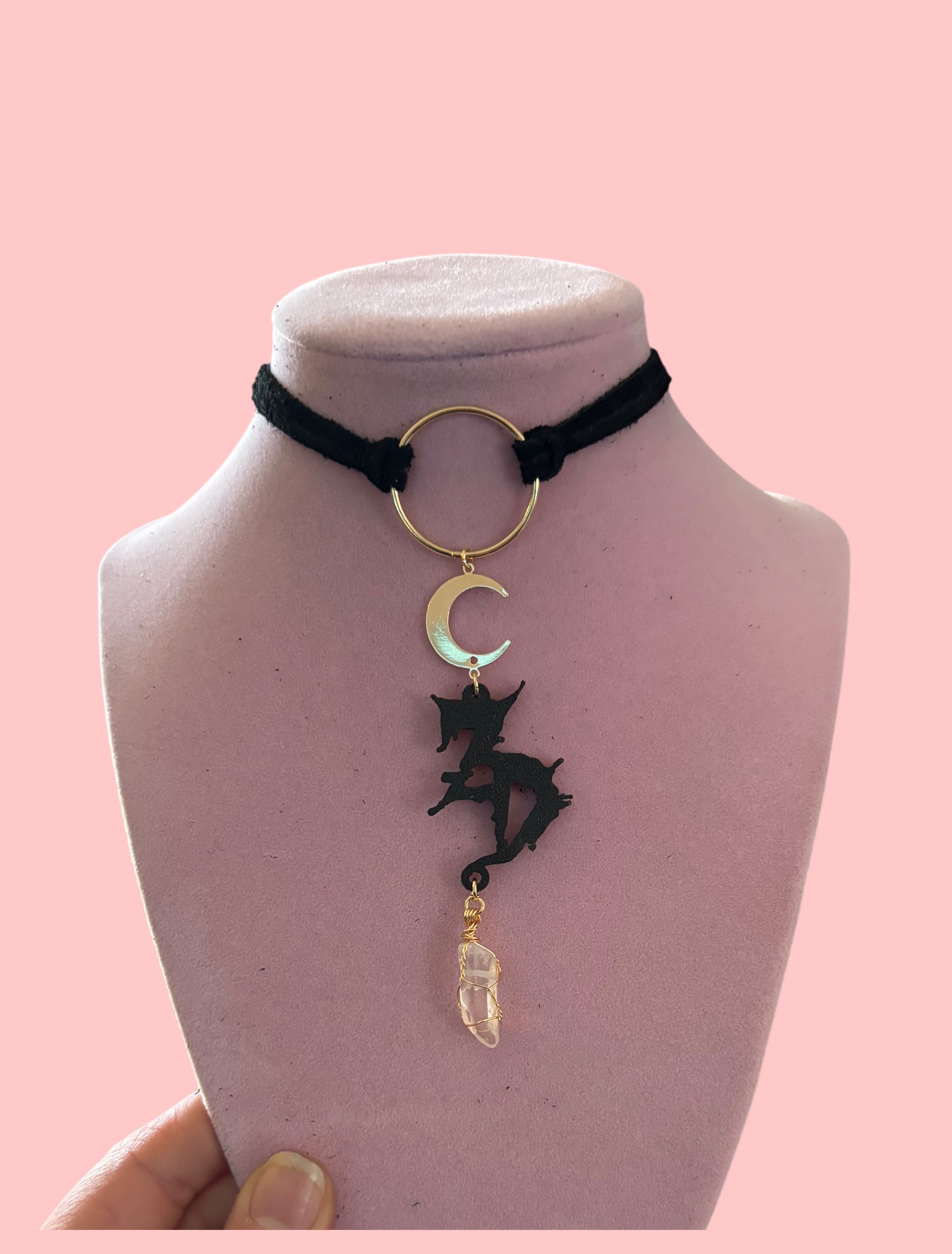 1 inch metal o ring, suede cord, tie back and adjustable, 3d printed artist charm and silver or gold moon charms and crystals. Crystal size may slightly vary