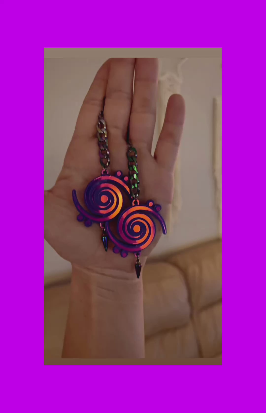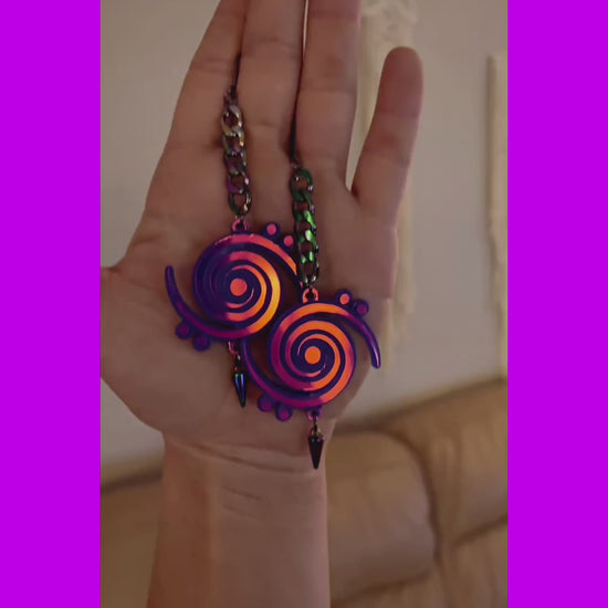iridescent stainless steel curb chain and matching studs. customizable violet holographic acrylic artist charms. roughly 3.5 inches