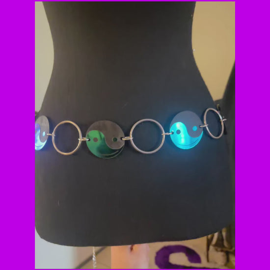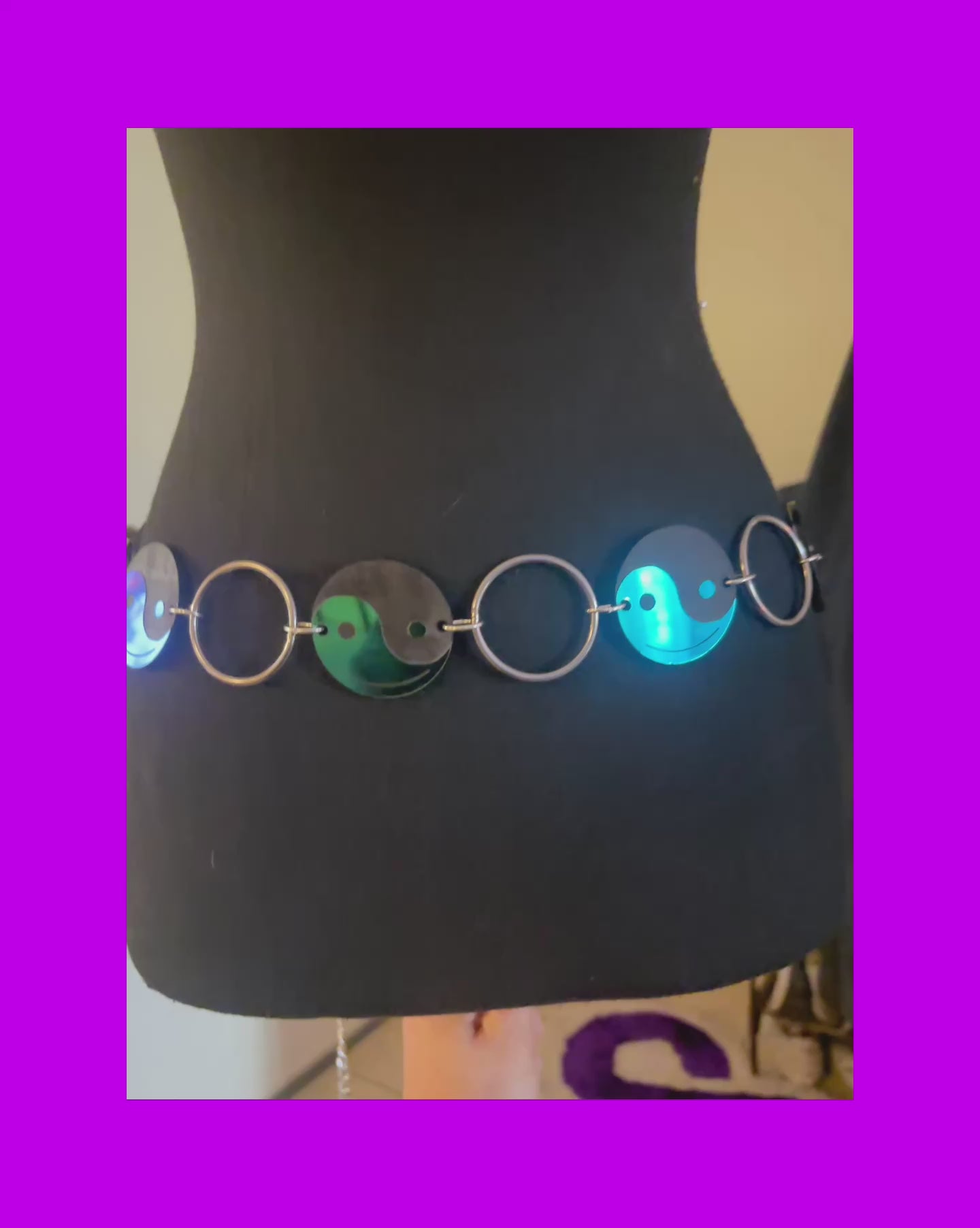 midnight holographic acrylic artist charms w 1.5 inch metal rings! Color is overall red with a green/yellow holographic color shift and engraves black! For sizing - select the range your waist size falls in. The belt and rings are made to that size and I then add about 10 inches of chain for adjustability down the hips!