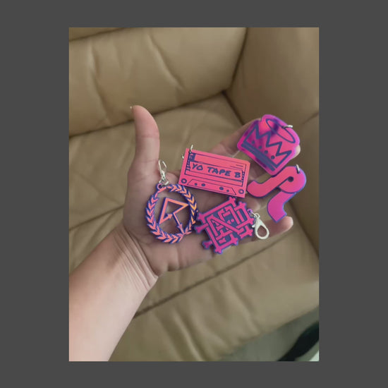 acrylic charms-overall violet color with a hot pink/yellow color shift that engraves an indigo blue! your choice of small medium or large- see photos for size reference- attached to a hat clip or clasp to hang from your hats, keychains, outfits, anything!