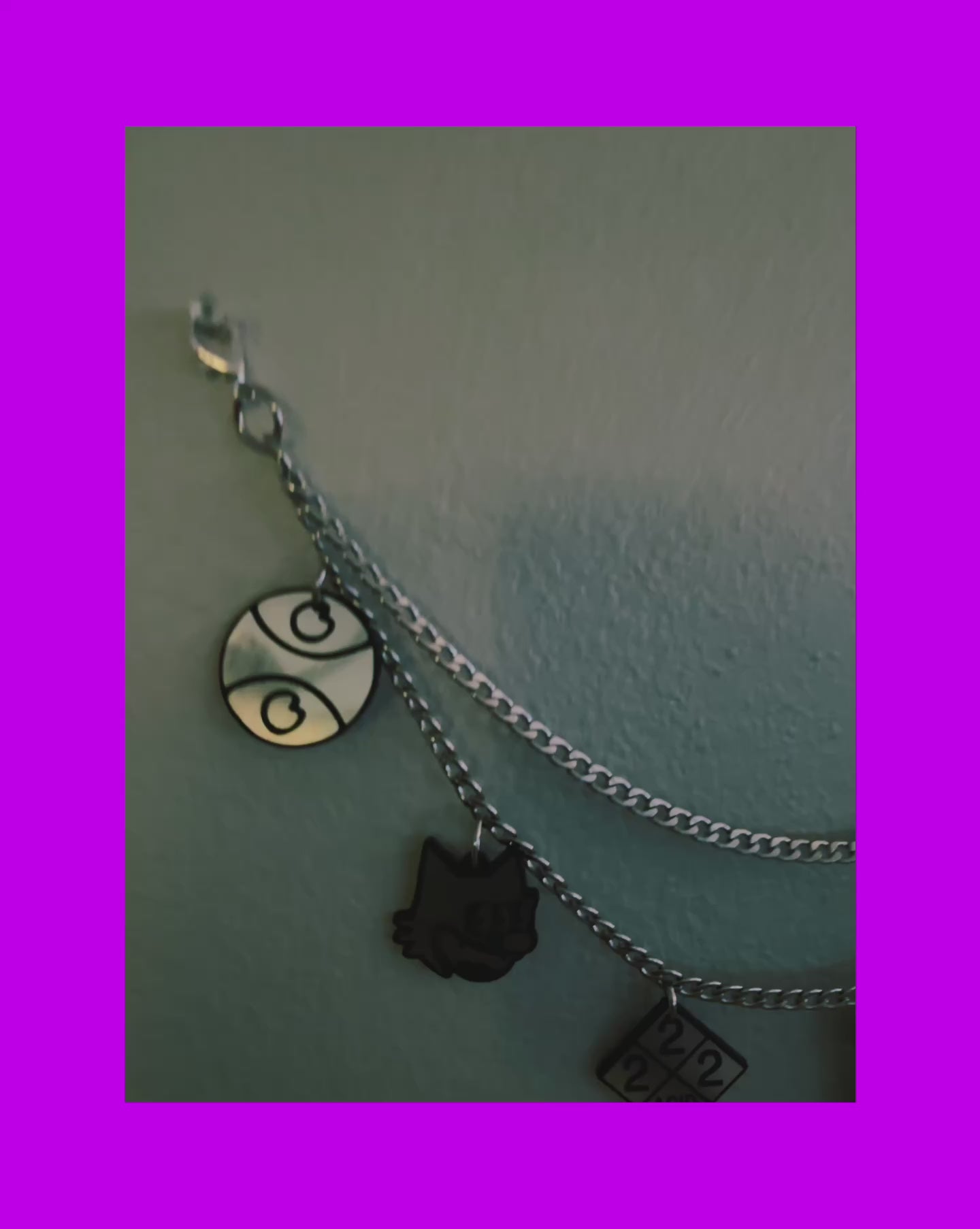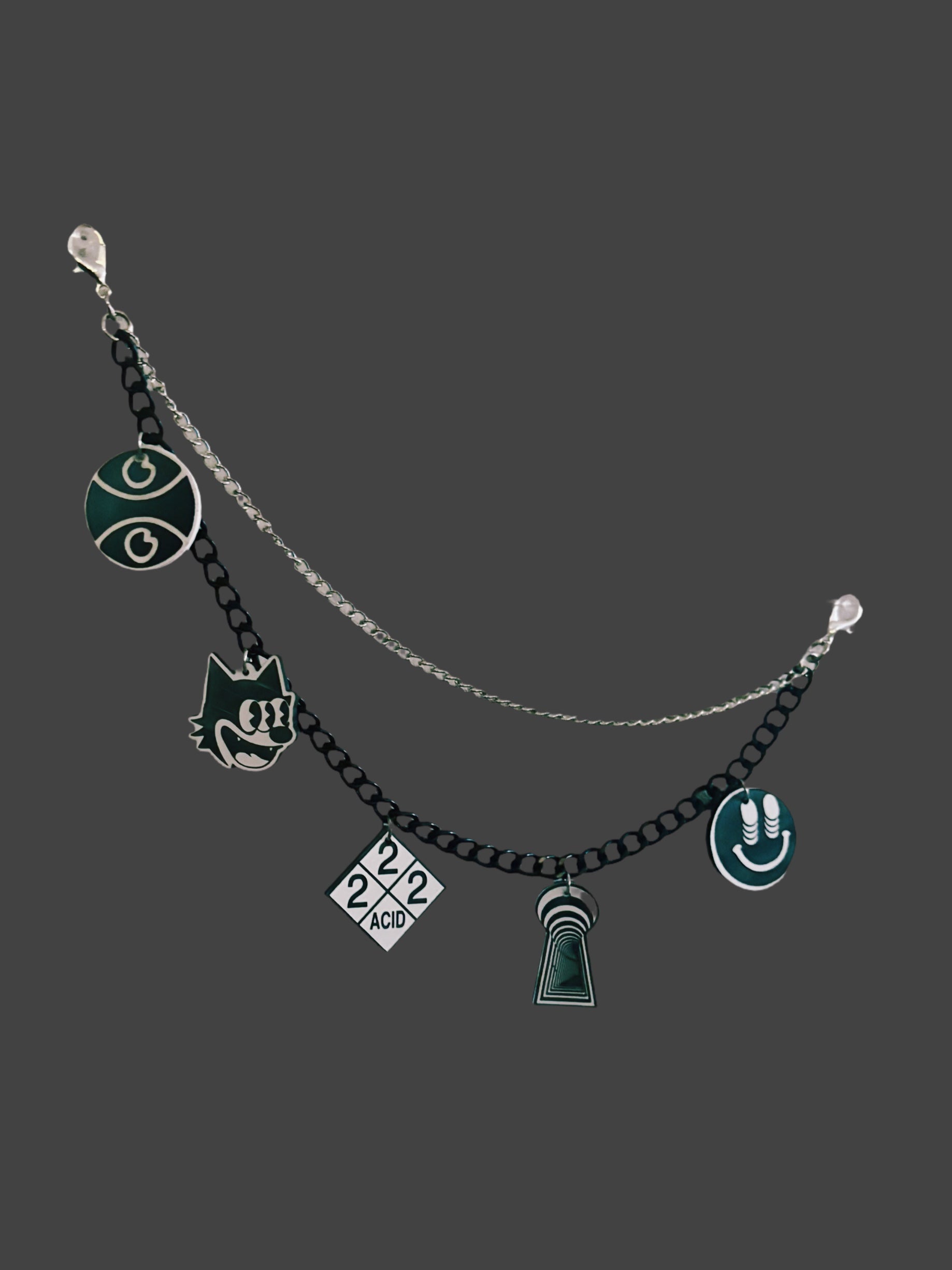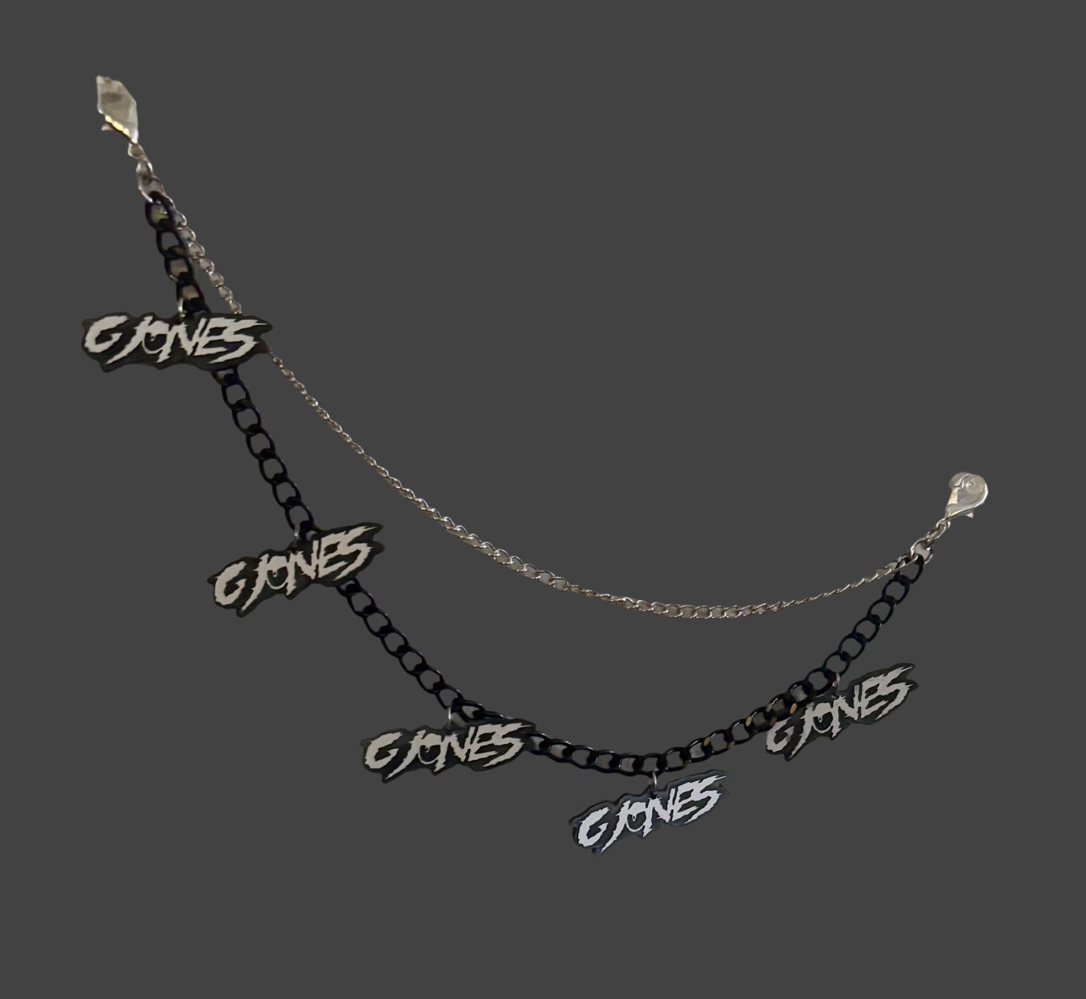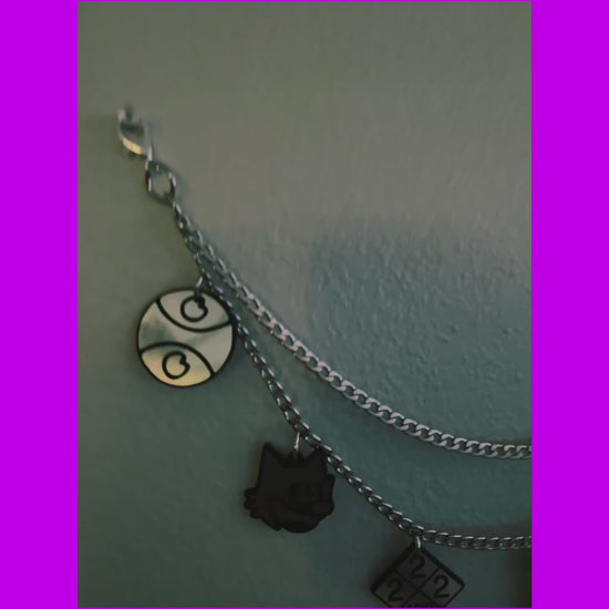 Black iron and silver chain with black and white acrylic charms, or silver stainless steel chain with black and silver acrylic charms!