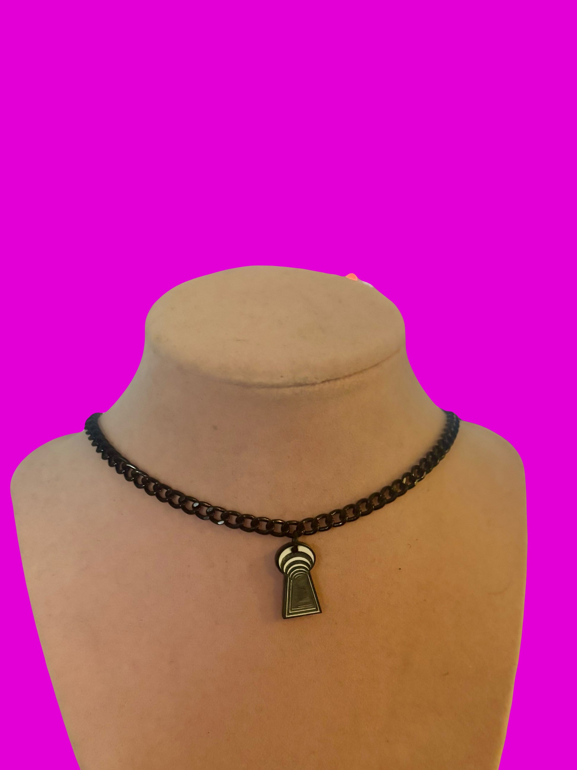 silver stainless steel chain w silver and black acrylic charms, or black chain with black and white acrylic charm. adjustable closure to wear looser if prefered.