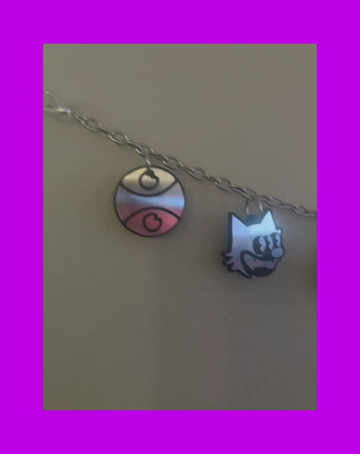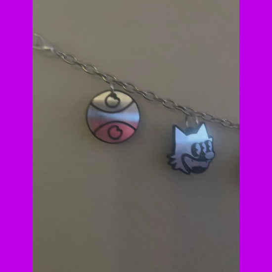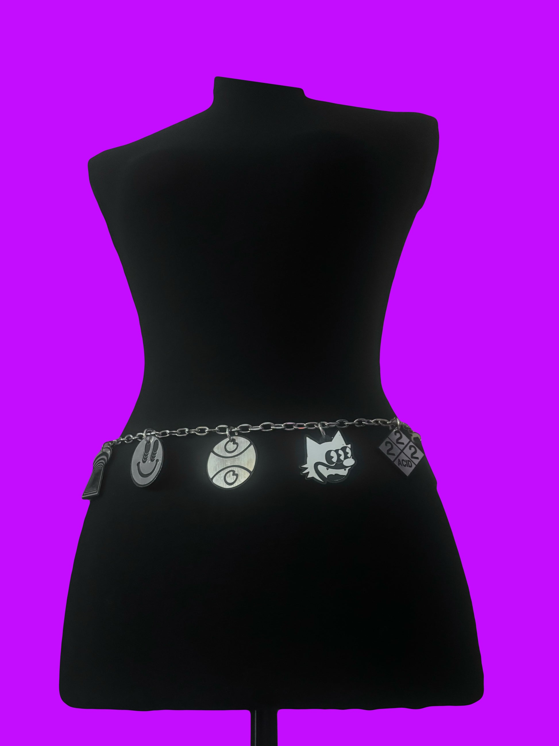 Your choice between black iron & silver stainless steel chain OR simple silver stainless steel. Each belt includes the following G Jones inspired charms- G jones eyes, smiley, triple eyed felix, and acid! Your choice between black and white acrylic or brushed steel (silver) and black acrylic! Both acrylics are more durable than your standard acrylic!