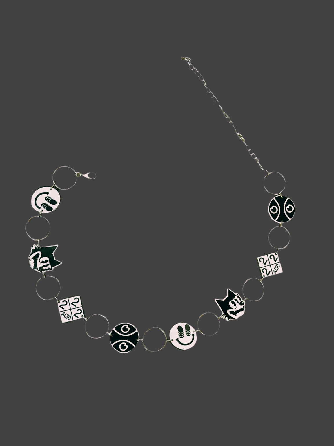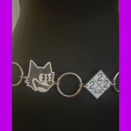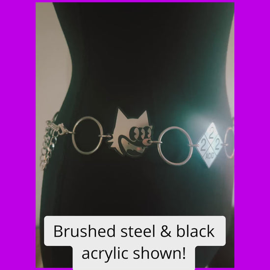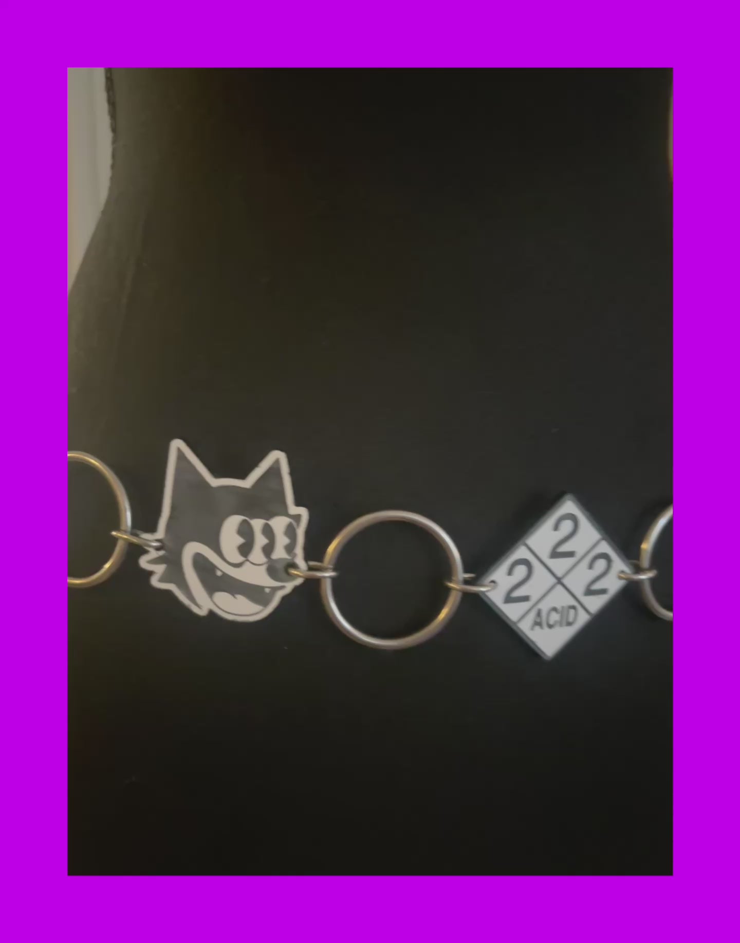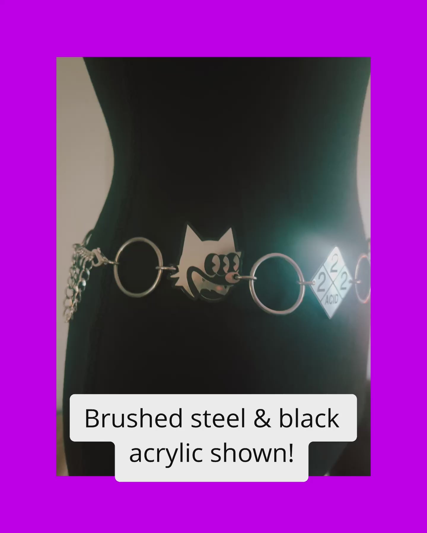 Acrylic belt with 1.5 inch metal rings! each belt includes the following G Jones inspired charms- G jones eyes, smiley, triple eyed felix, and acid! Your choice between black and white or brushed steel (silver) and black acrylic! Both acrylics are more durable than your standard acrylic!