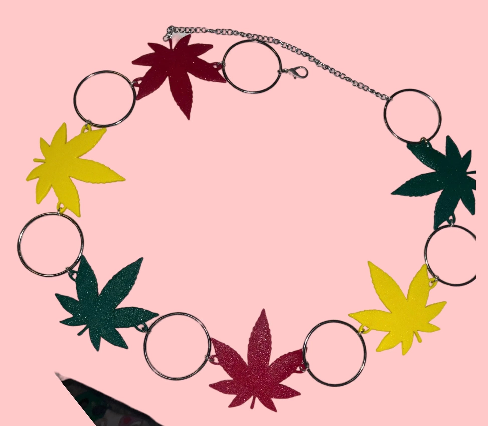 2-3 inch 3d printed hemp leaf charms + 2 inches metal rings. Please select the size your waist falls into, I then add about 10 inches of chain for adjustability down the hips.