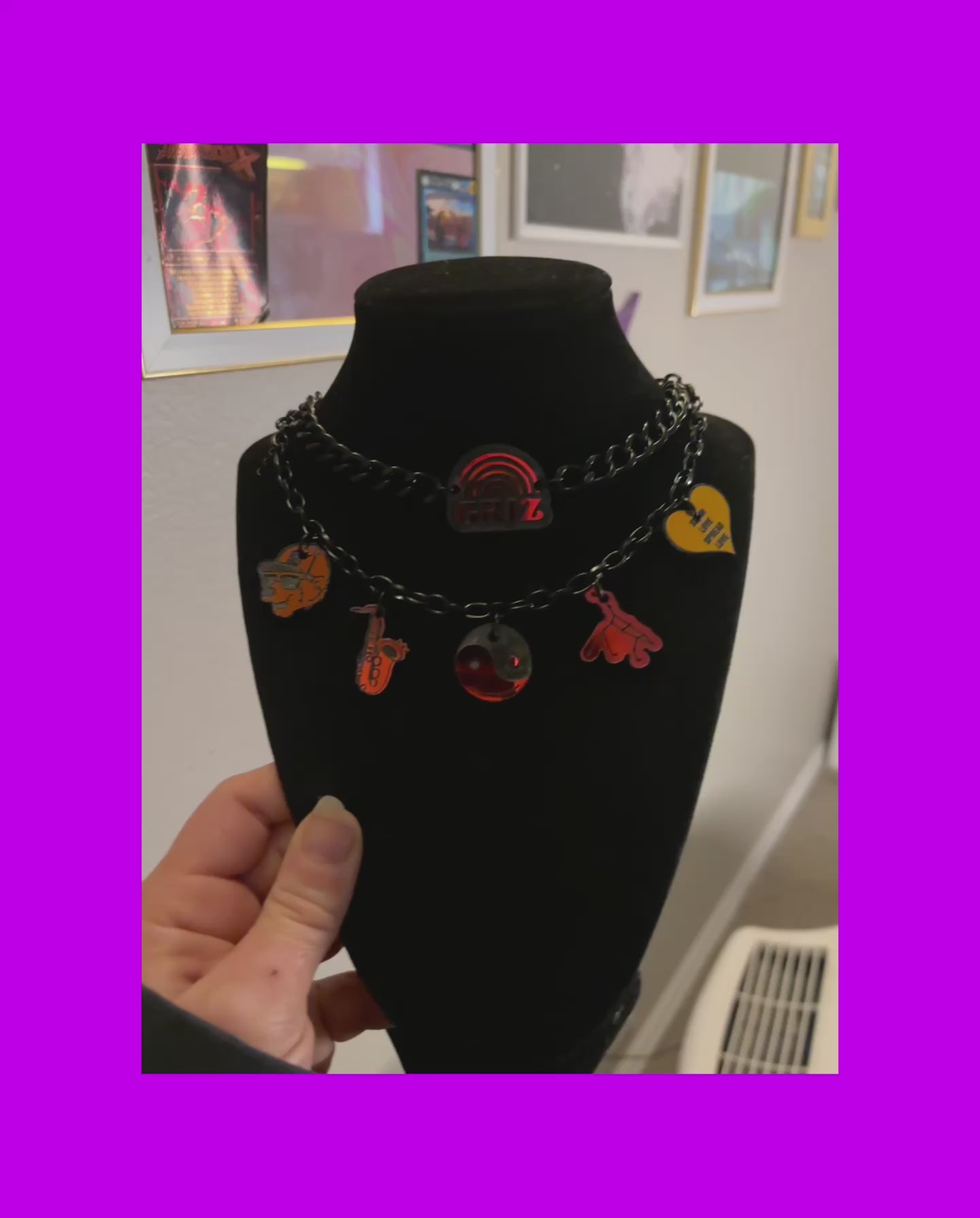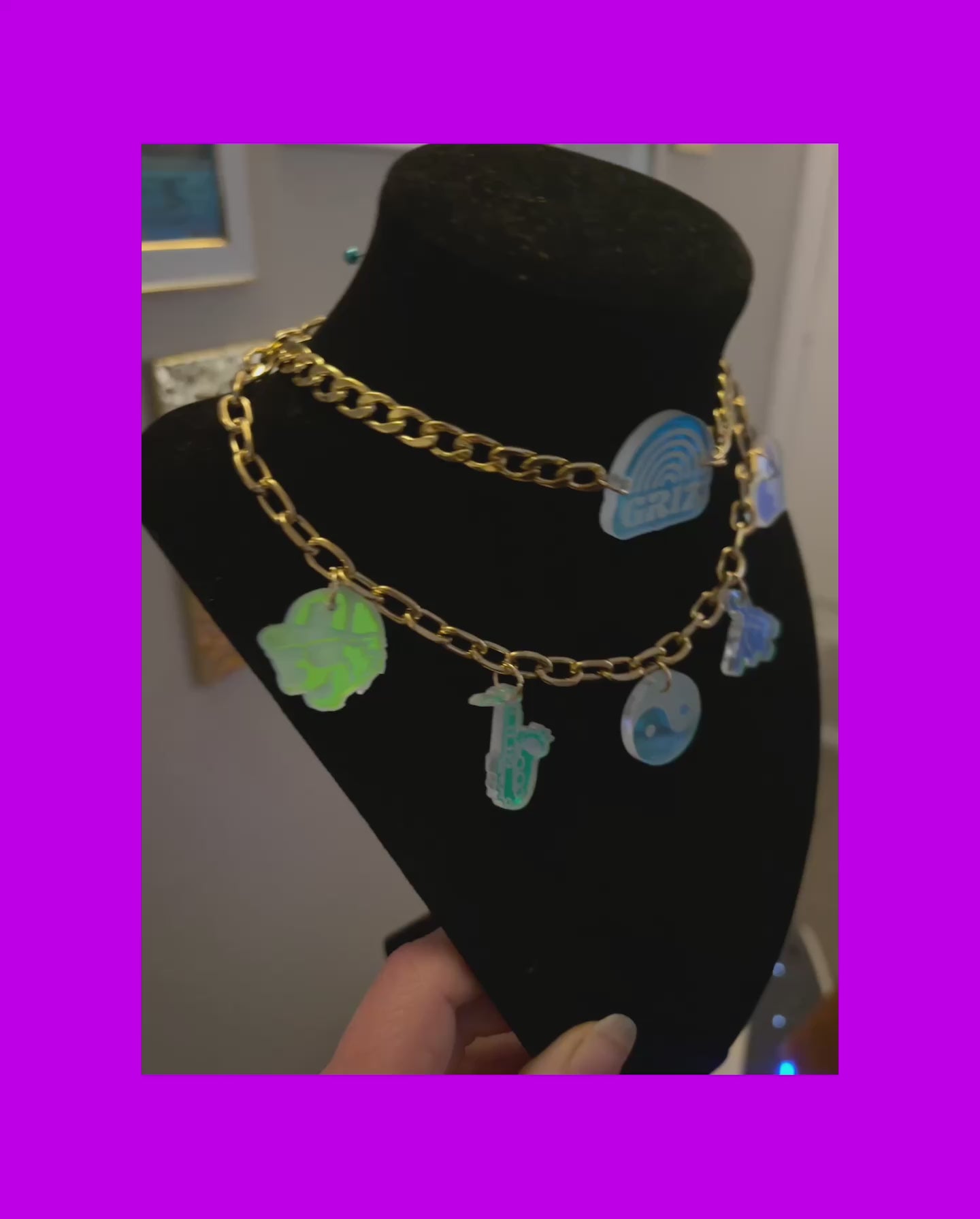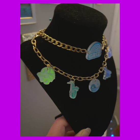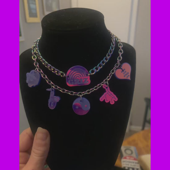 Stainless steel chains, acrylic charms! Holographic stainless steel chain and violet holographic charms shown in photo.
