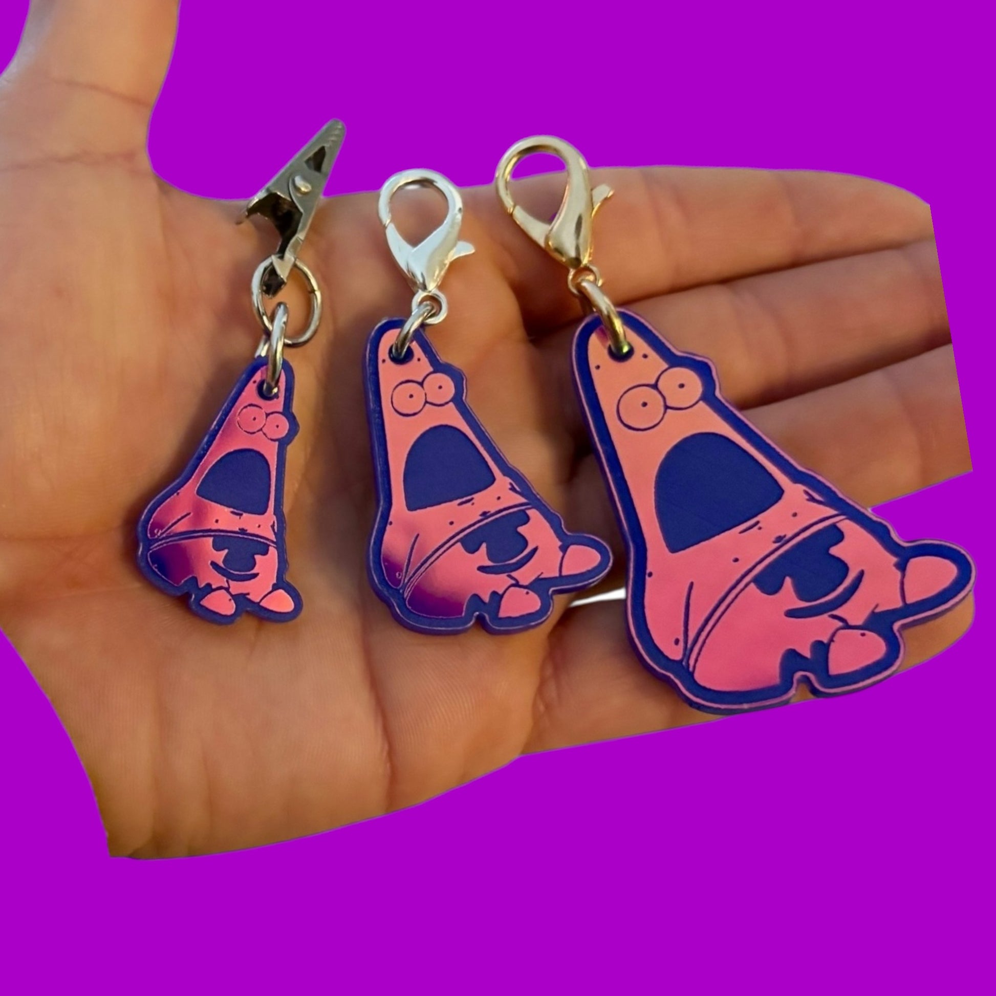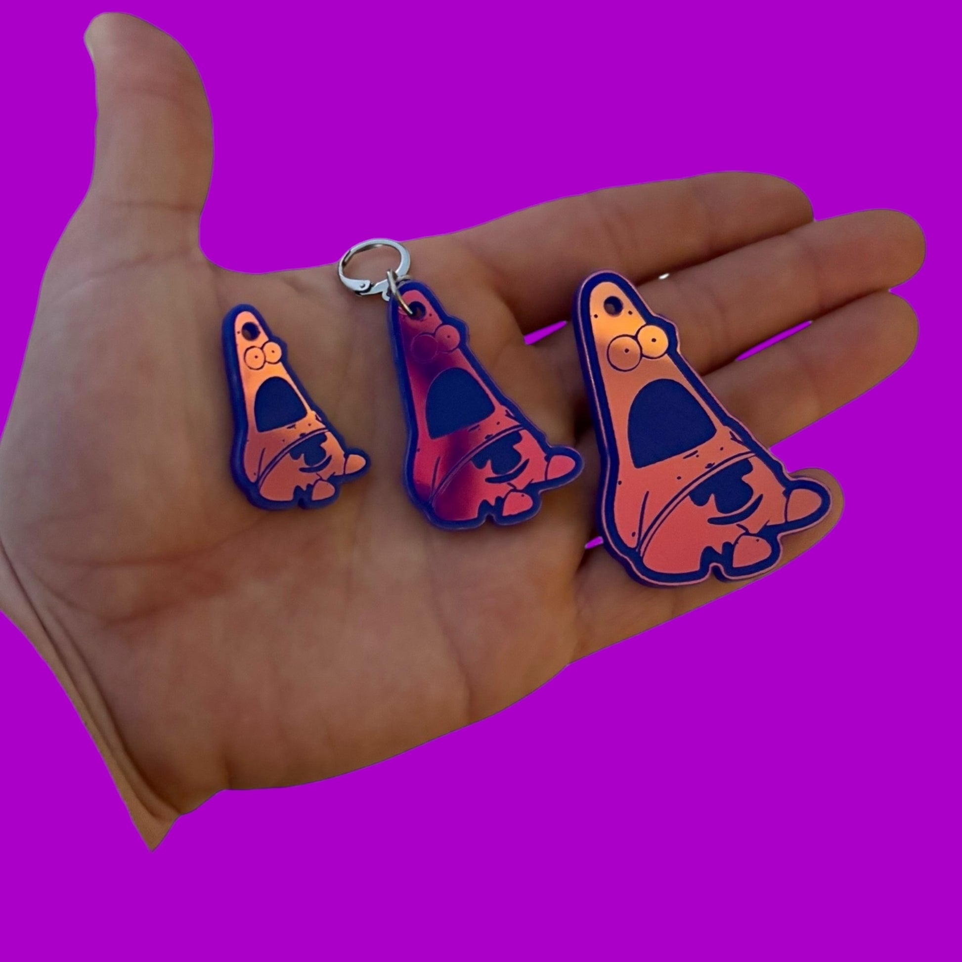 made with holographic acrylic. a hot pink/violet/yellow/green color shift. small charm 1-2 inches, medium 1.5-2.5 inches, and large 2-3 inches. your choice of hat clip to hang from hats or clasp to clip onto anything!
