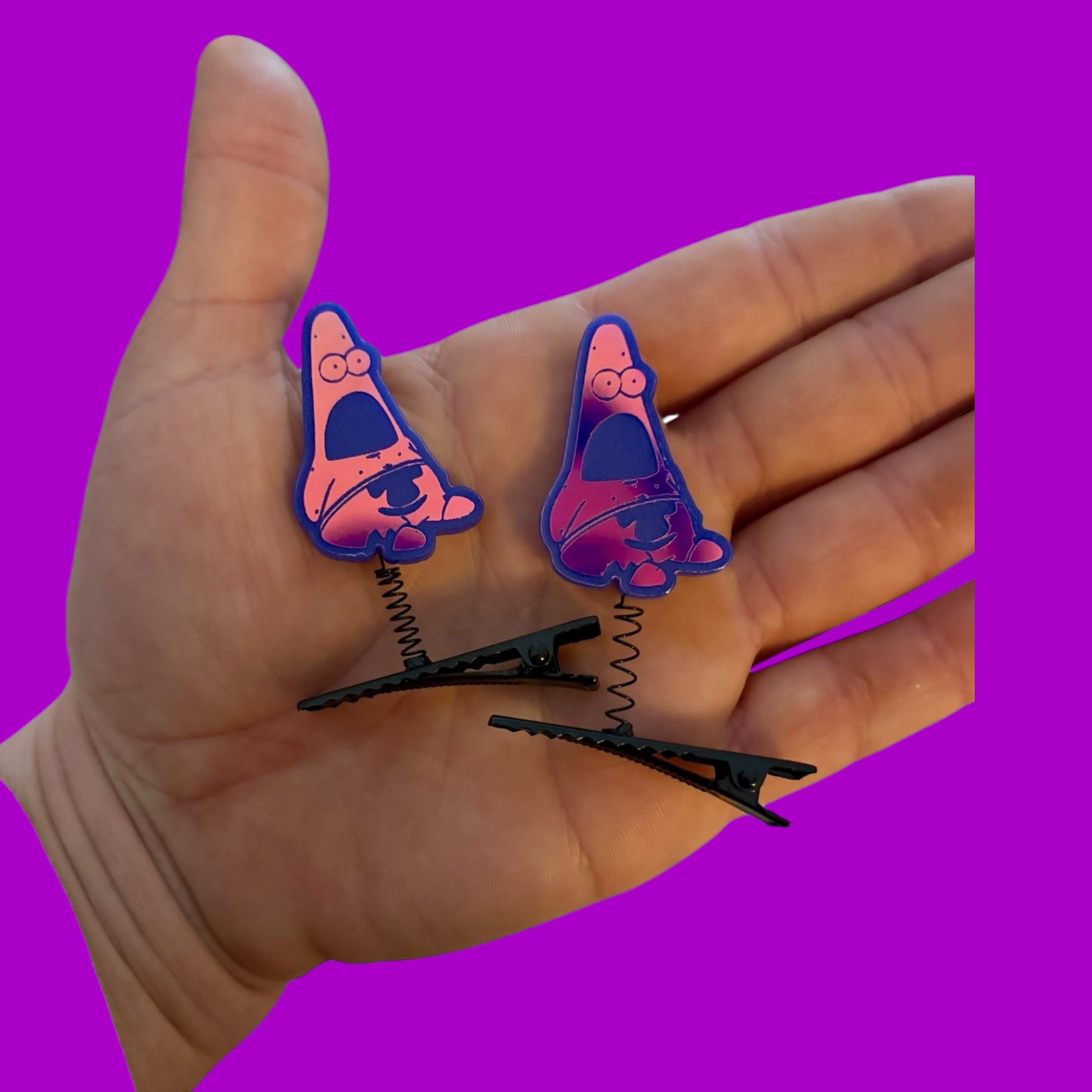Acrylic charms super glued onto spring sprout clips! color has a hot pink/violet/yellow/green color shift!