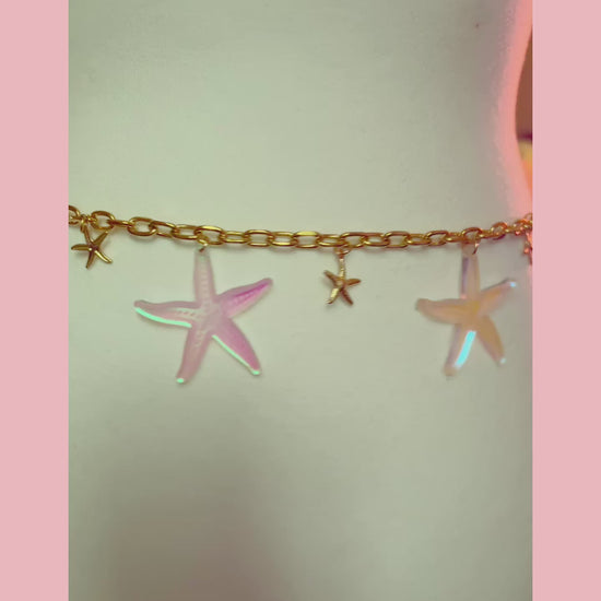 Your choice of iridescent starfish or seashell acrylic charms, gold starfish charms, and gold stainless steel cable chain!