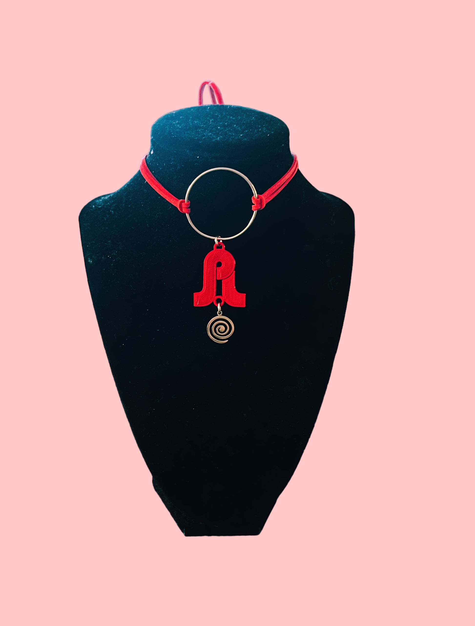 1 inch metal o ring, suede cord, tie back and adjustable, 3d printed PL charm and silver or gold swirl charm.