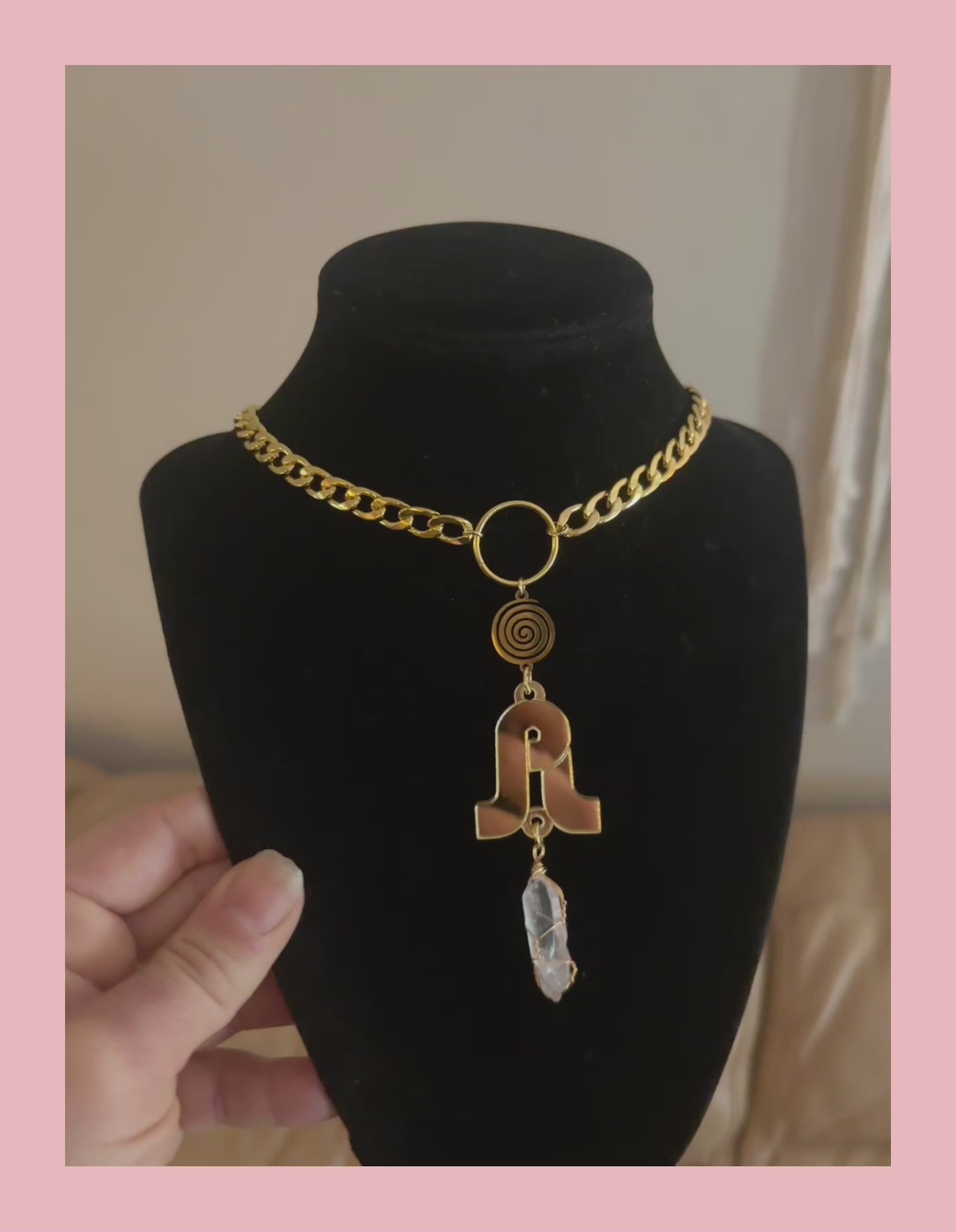 Stainless steel chain, o ring, mirror acrylic pl charm, Crystal, adjustable closure. Size of crystals may slightly vary.