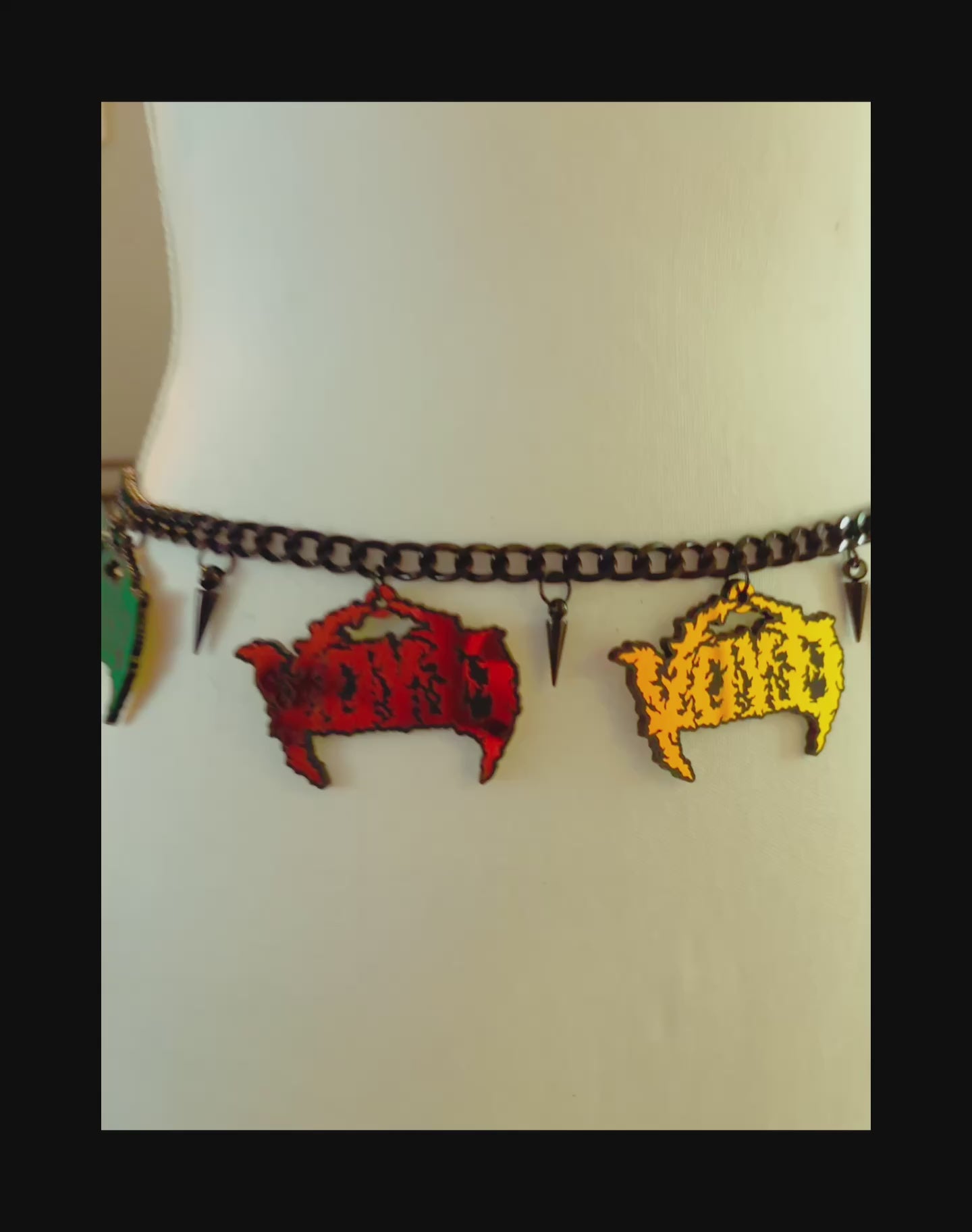 Black iron chain, holographic VOYD charms (about 2.5 inches) black stud charms. Holographic material has a red/green/yellow color shift with a black base!