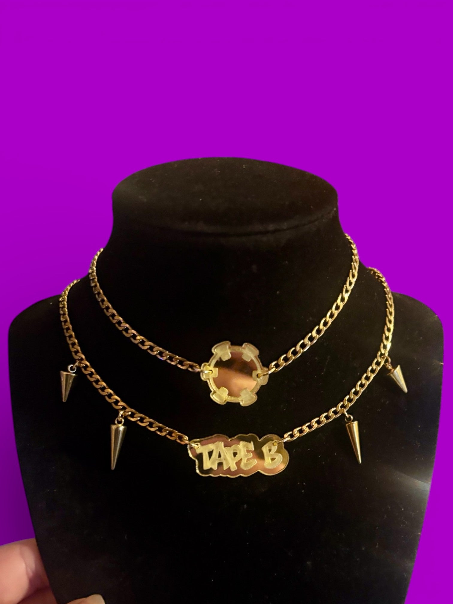 silver or gold chains will match silver/gold mirror acrylic or brushed silver and black/brushed gold and black perfectly. The brushed Steel and black acrylics will have more of a contrast than the mirror🙂Â