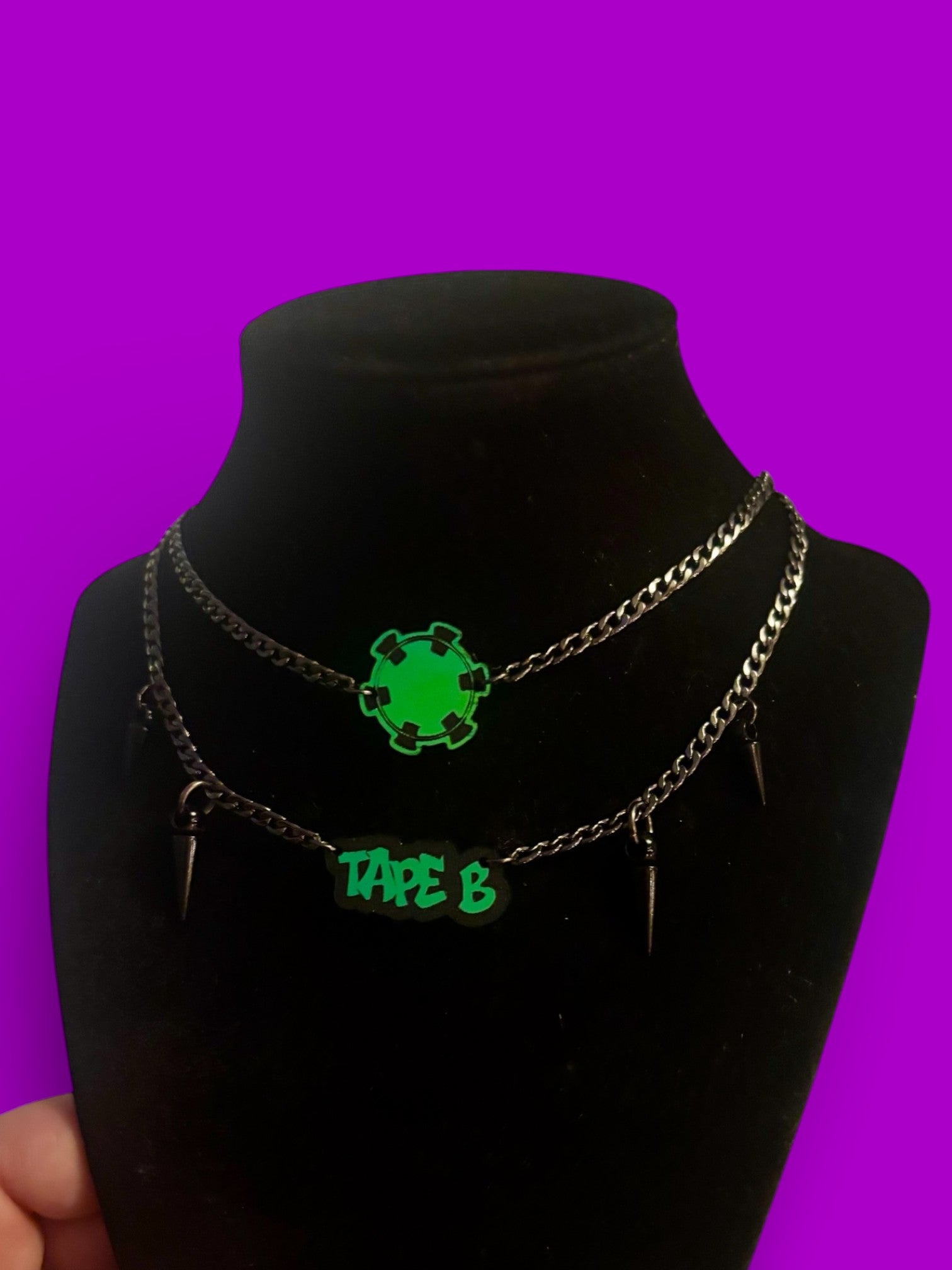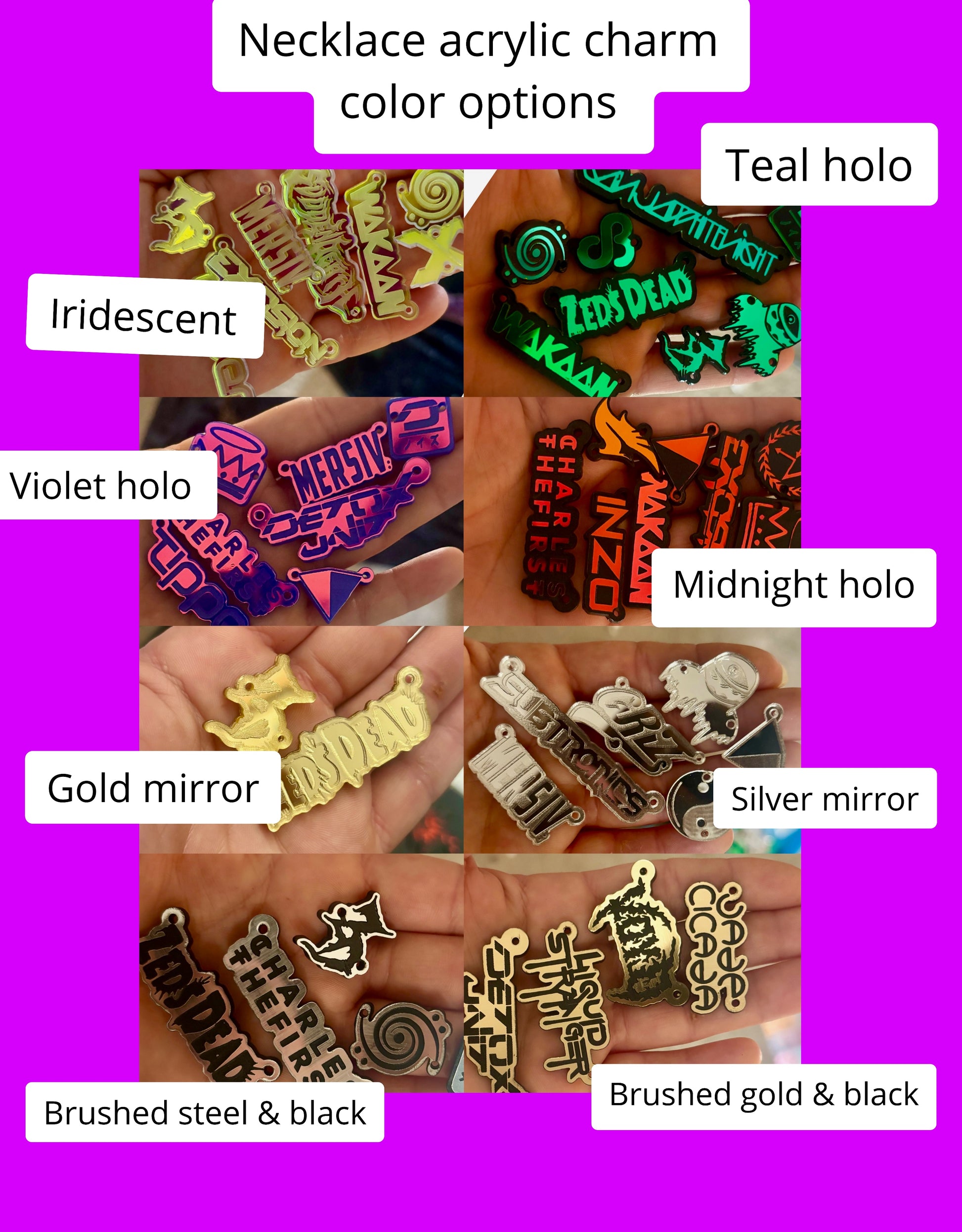 black chain pairs perfectly with the midnight and teal holographic acrylic charms as well as black and white! All of these acrylics engrave black- perf match!