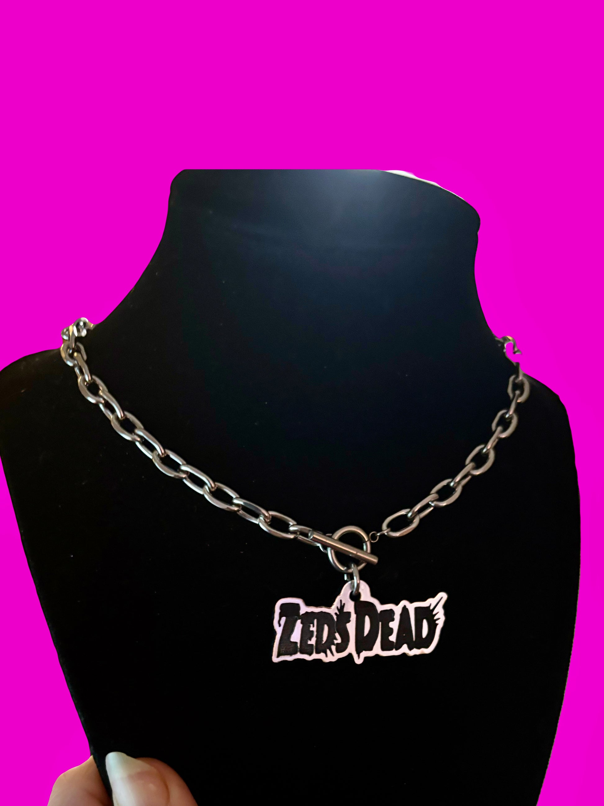 Cable stainless steel chain-color of your choice-with matching toggle closure! your choice of acrylic charm color! Brushed steel and black acrylic charm shown in main photo